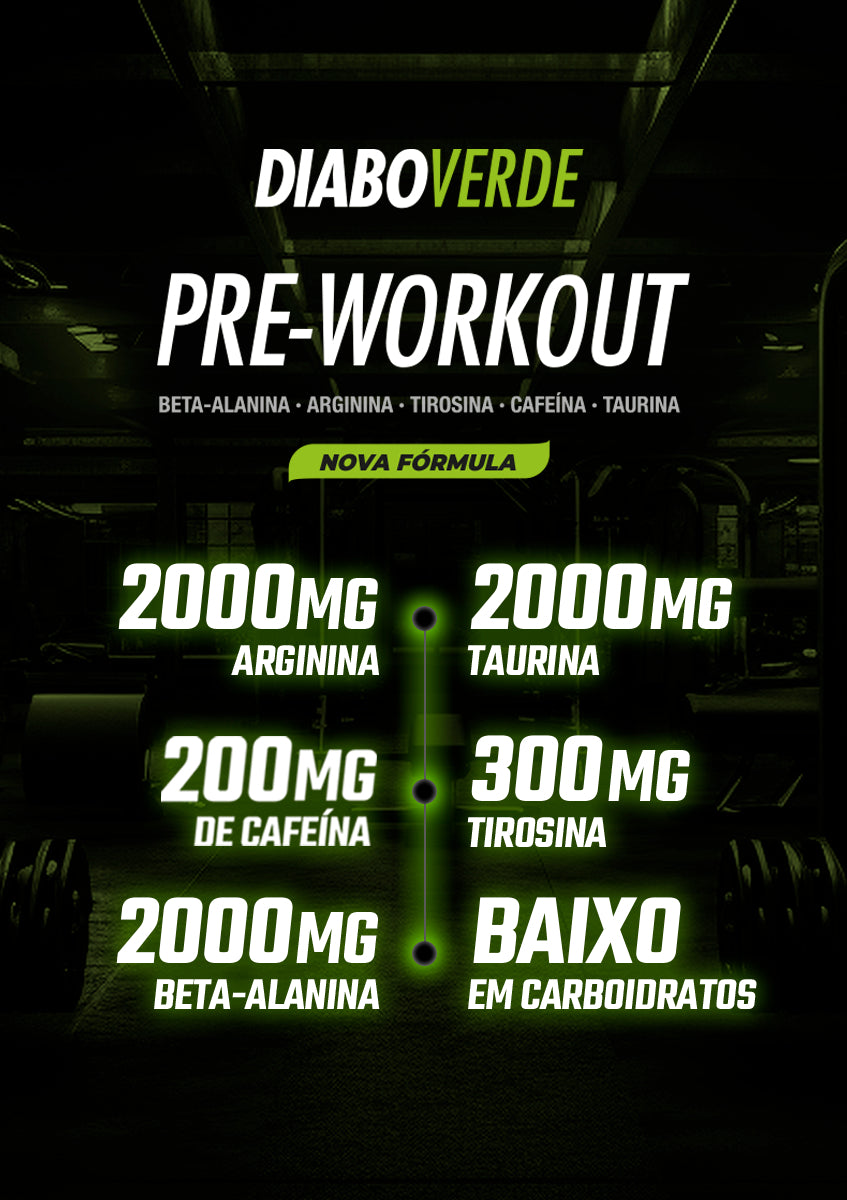 Diabo Verde #Pre-Workout é um suplemento alimentar em pó com combinação de aminoácidos e cafeína, desenvolvido para consumo antes da prática de atividades físicas, conforme orientação de profissional habilitado.